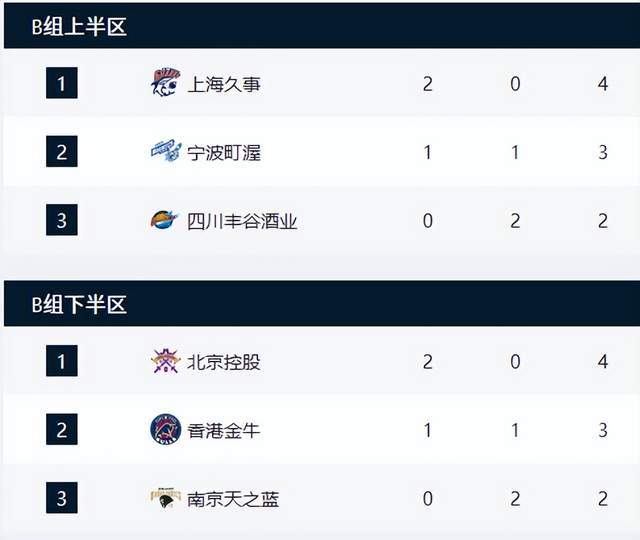 除了A组有5支球队,需要打循环赛来确定前2名外,其他3个小组都是打得分区赛。B组上半区,上海男篮2战2胜,排名第2,宁波男篮1胜1负,排名第2,四川男篮0胜2负,排名垫底。B组下半区,北控男篮2战2胜,排名第1,香港金牛1胜1负,排名第2,南京同曦0胜2负,排名垫底。