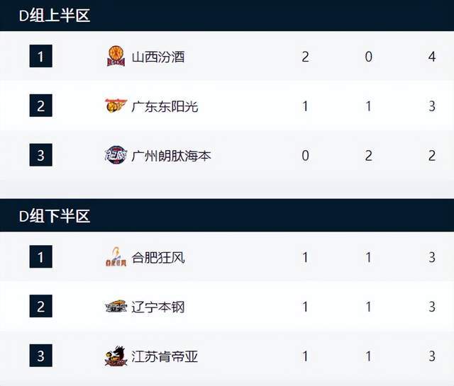 D组上半区,山西男篮2战2胜,排名第1,广东男篮1胜1负,排名第2,广州男篮0胜2负,排名垫底。D组下半场,合肥狂风男篮1胜1负,排名第1,辽宁男篮1胜1负,排名第2,江苏男篮1胜1负,排名第三。