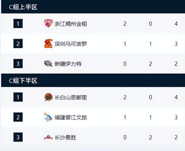 C组上半区,浙江男篮2战2胜,排名第一,深圳男篮1胜1负,排名第2,新疆男篮0胜2负,排名垫底。C组下半区,吉林男篮2战2胜,排名第1,福建男篮1胜1负,排名第2,长沙男篮0胜2负,排名垫底。